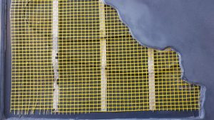 Easy, de Fermacell vloerplaten worden over de ondervloer geplaatst, ze zijn 25 mm hoog. Vervolgens worden er sleuven in de platen gefreesd waar de buizen in geplaatst kunnen worden. De sleuven zullen op 17 mm diepte geplaatst worden. Als alles is in gefreesd en geplaatst gaan we de sleuven met een speciaal reparatiemortel dicht zetten.
